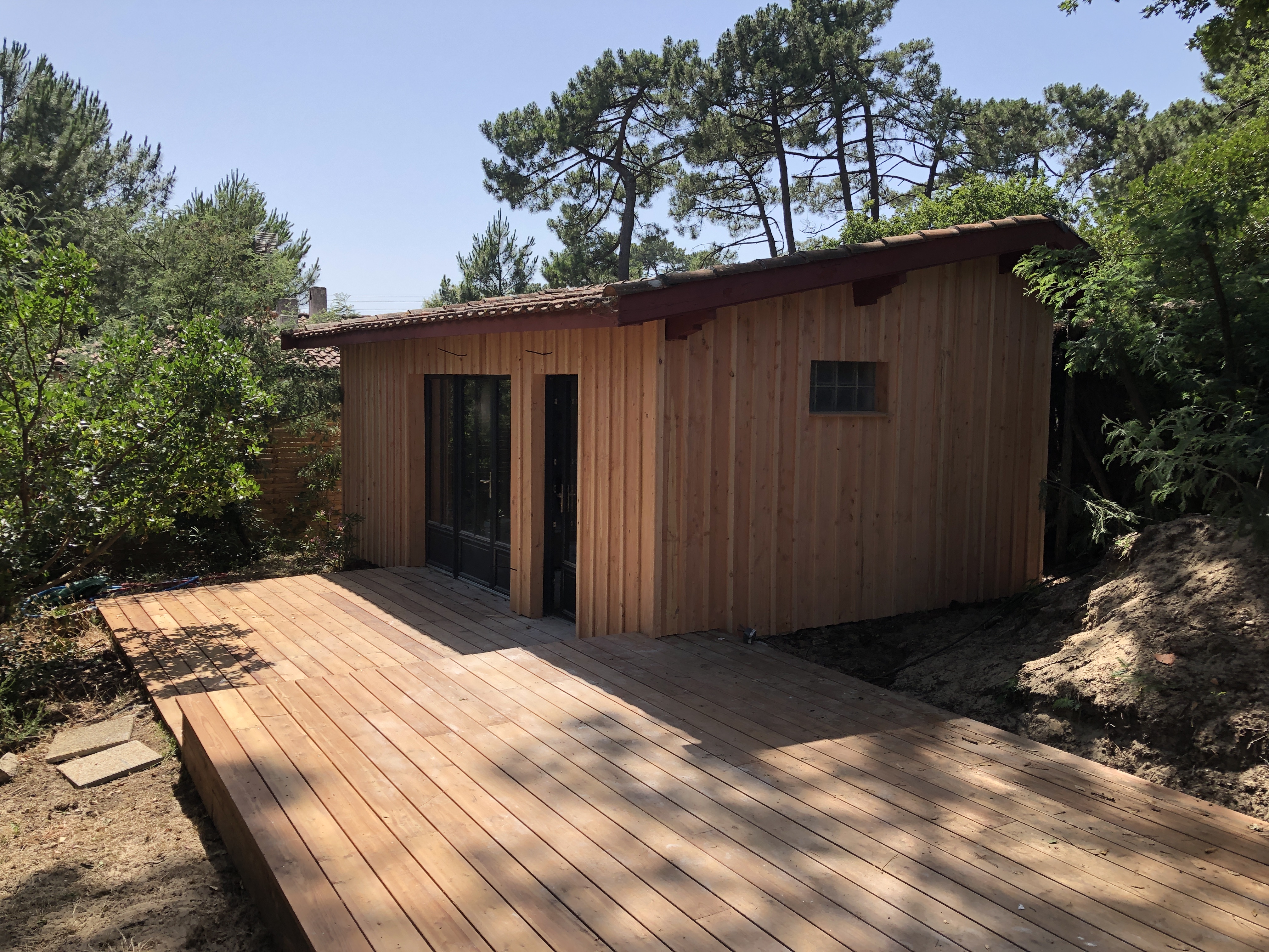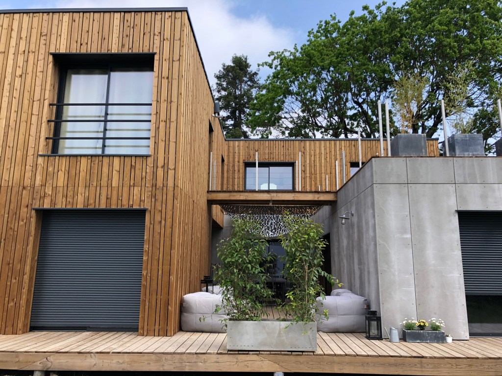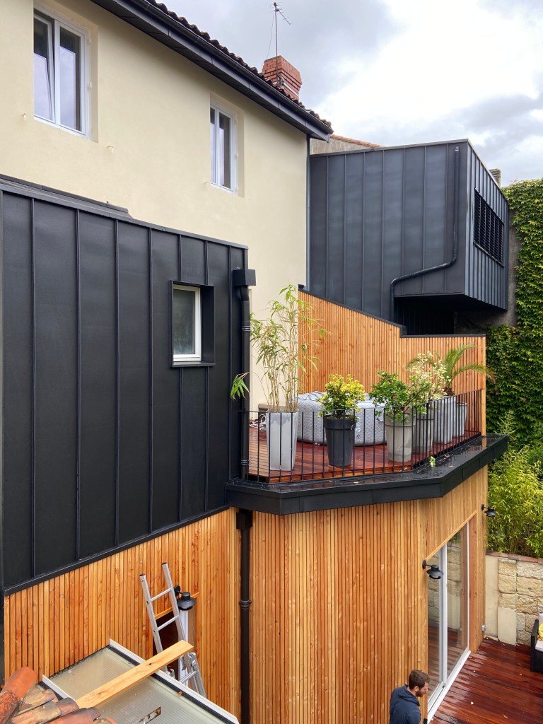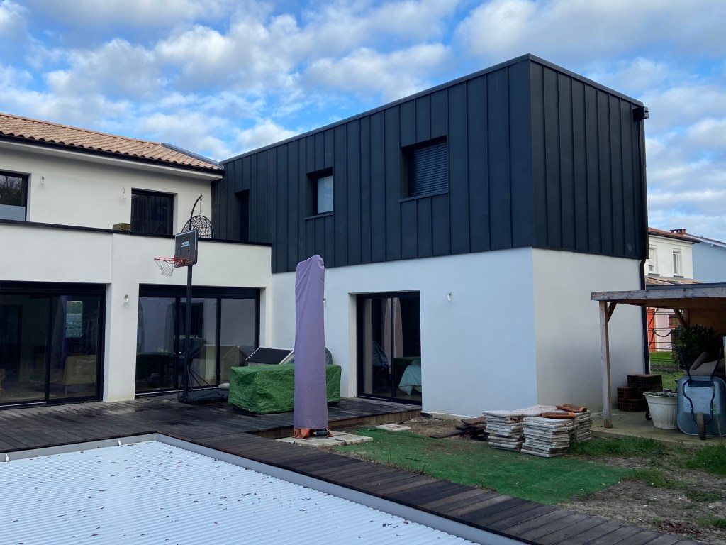 Bardage bois claire voie vertical, essence pin maritime traité, autoclave brun avec bardage Viroc (fibro bois et ciment)Bardage zinc à joint debout et bardage bois claire voie vertical, essence douglas